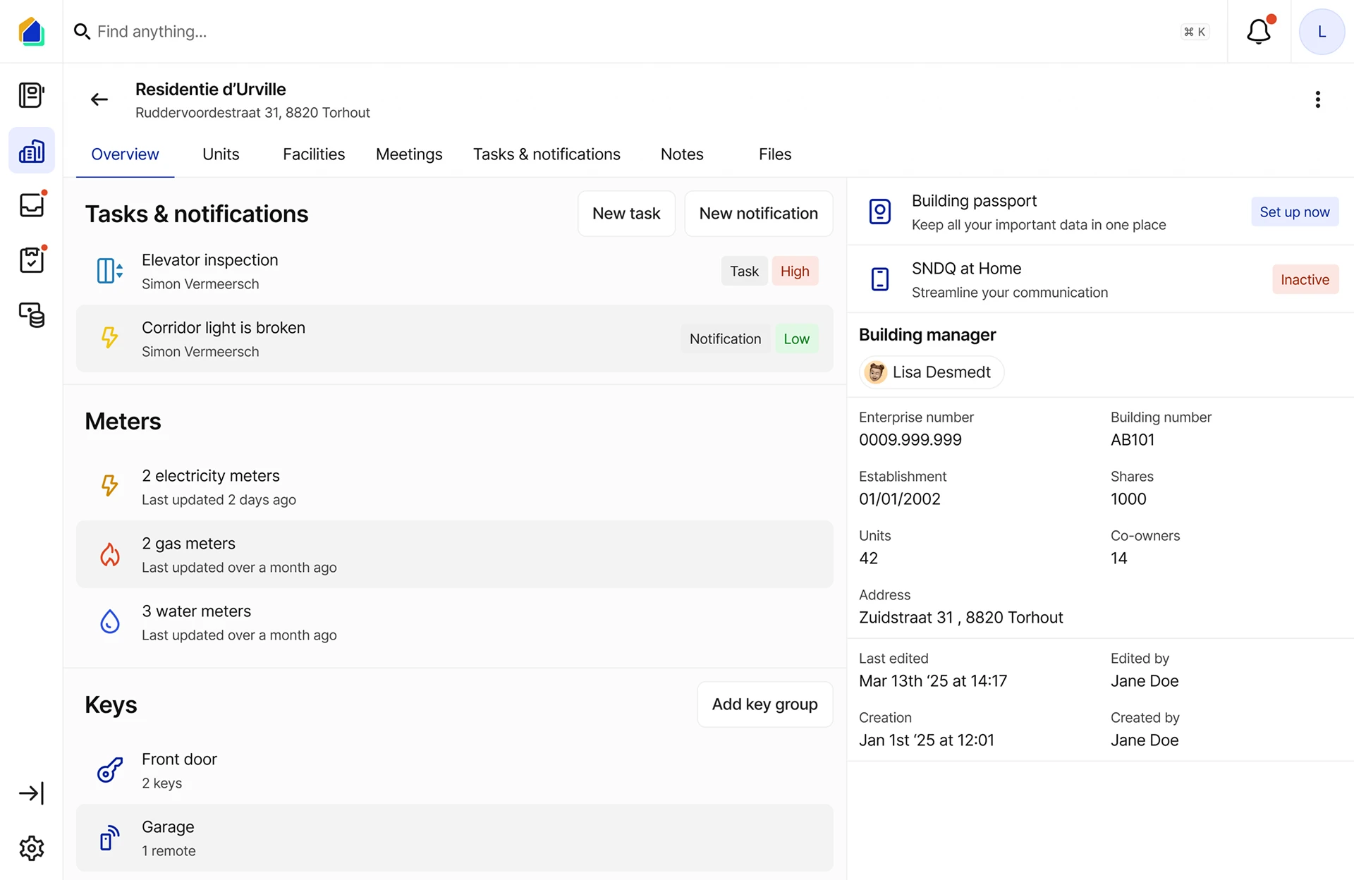 Beheer al je gebouwen, units en huurcontracten centraal in SNDQ. Of je nu een syndicus, verhuurder of rentmeester bent: je behoudt het overzicht, werkt efficiënter en bespaart tijd. Geen papieren rompslomp meer.